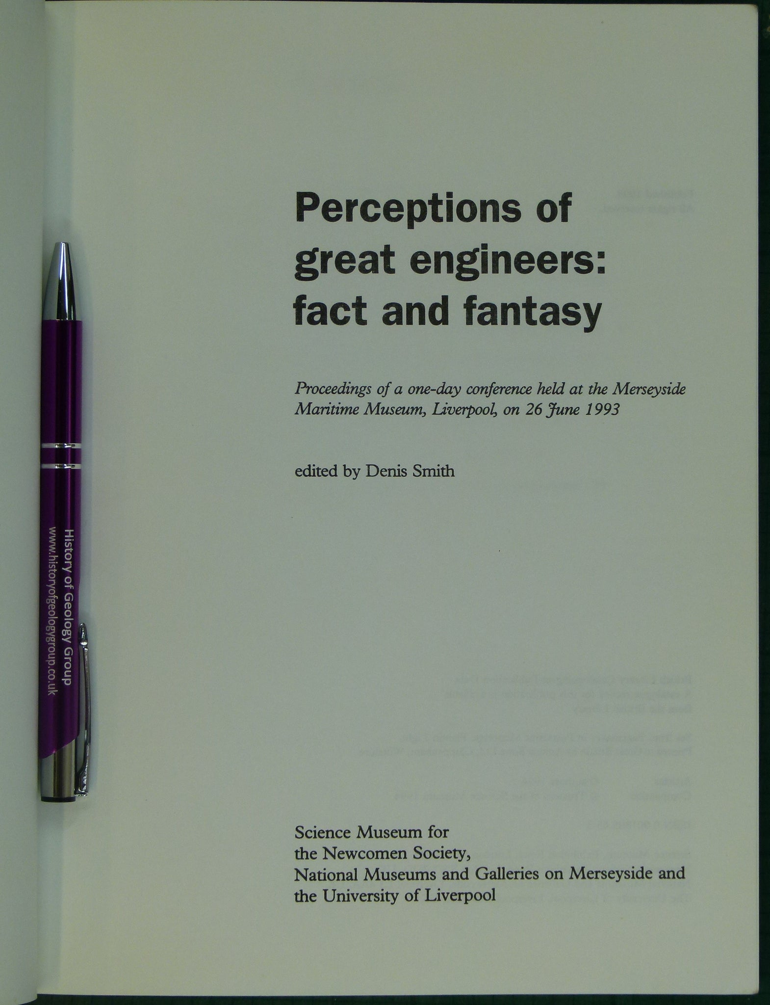 Smith, Denis (ed). (1994). Perceptions of Great Engineers; Fact and Fantasy; Proceedings of a one-day conference held at the Merseyside Maritime Museum June 1993. Liverpool: Science Museum for the Newcomen Society, 115pp. 1st edition. NON-GEOLOGICAL. Paperback. Cover faded, clean. Text clean, unmarked. Eight papers. See images for contents pages. In good to very good condition.