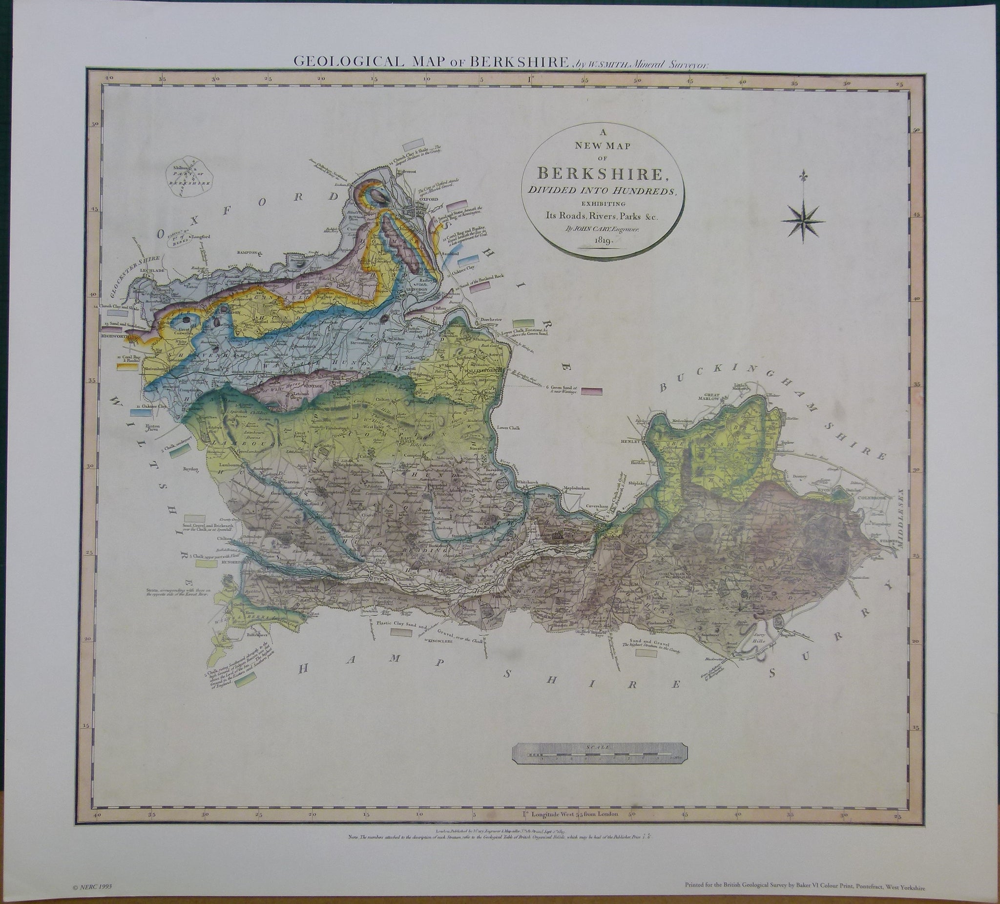 Smith, William. (1819). REPRO Geological Map of Berkshire of 1823. 1993 reproduction by British Geological Survey. 55 x 50 cm approx. 80% of original size. Bright colour reproduction on white silk-finish medium weight paper. Clean, flat. In very good to fine condition.