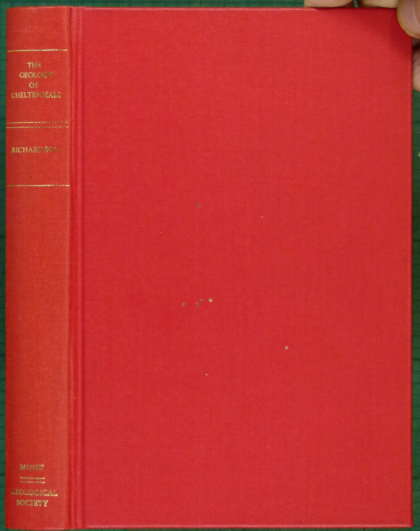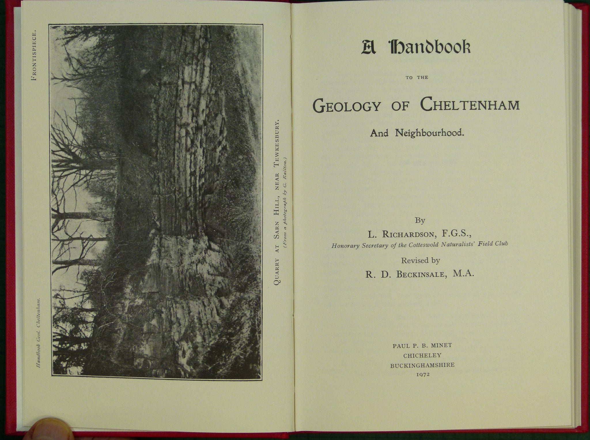 Richardson, L., (1904, facsimile 1972). A Handbook of the Geology of Cheltenham and Neighbourhood. Chichley: Minet [originally Cheltenham: Norman, Sawyer & Co.] 310pp. Hardback, red cloth-covered boards with gilt lettering to spine. Apart from neat owner signature on front end-paper, in as new condition.