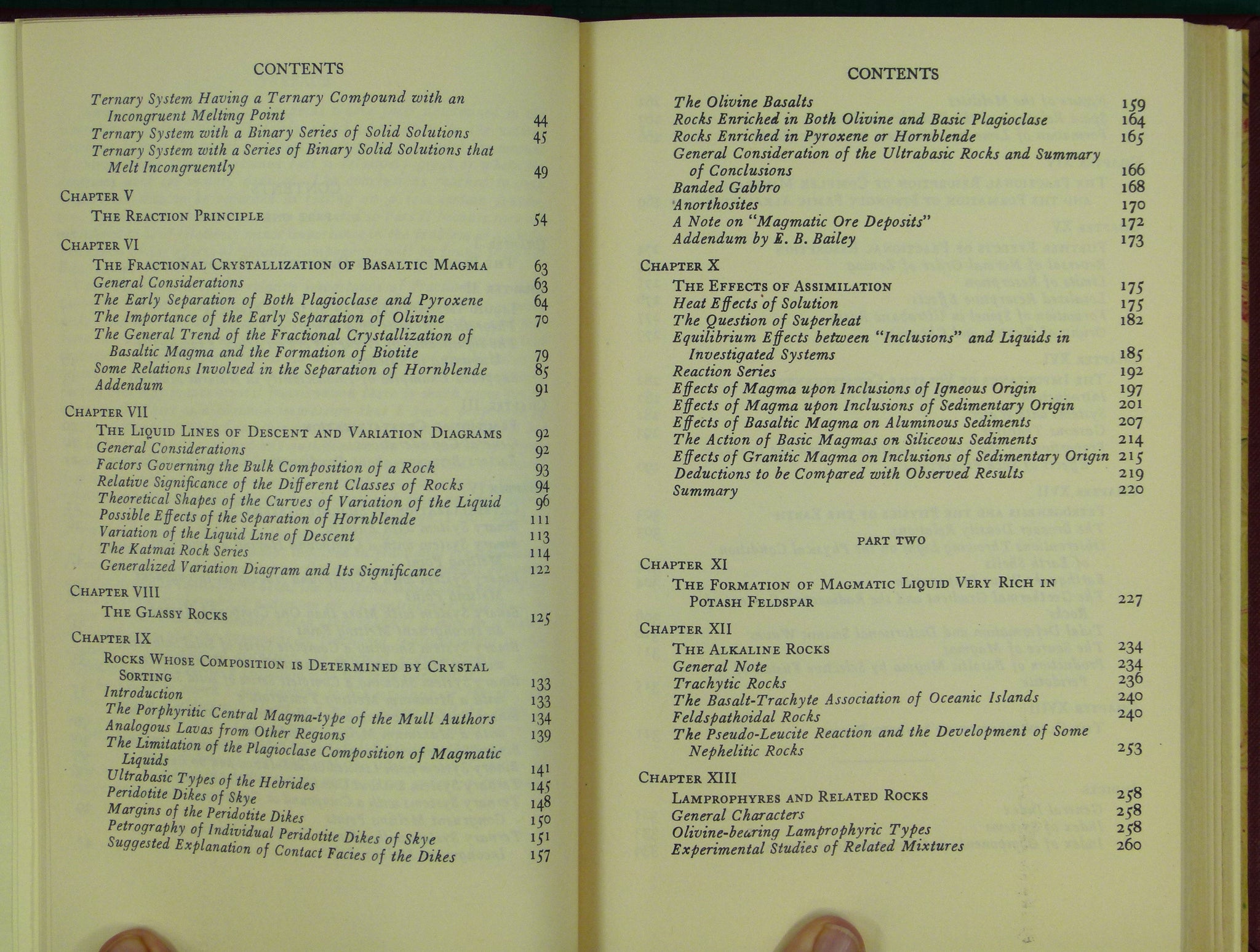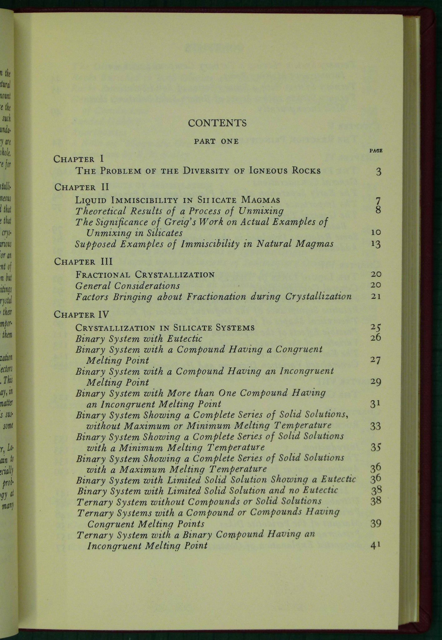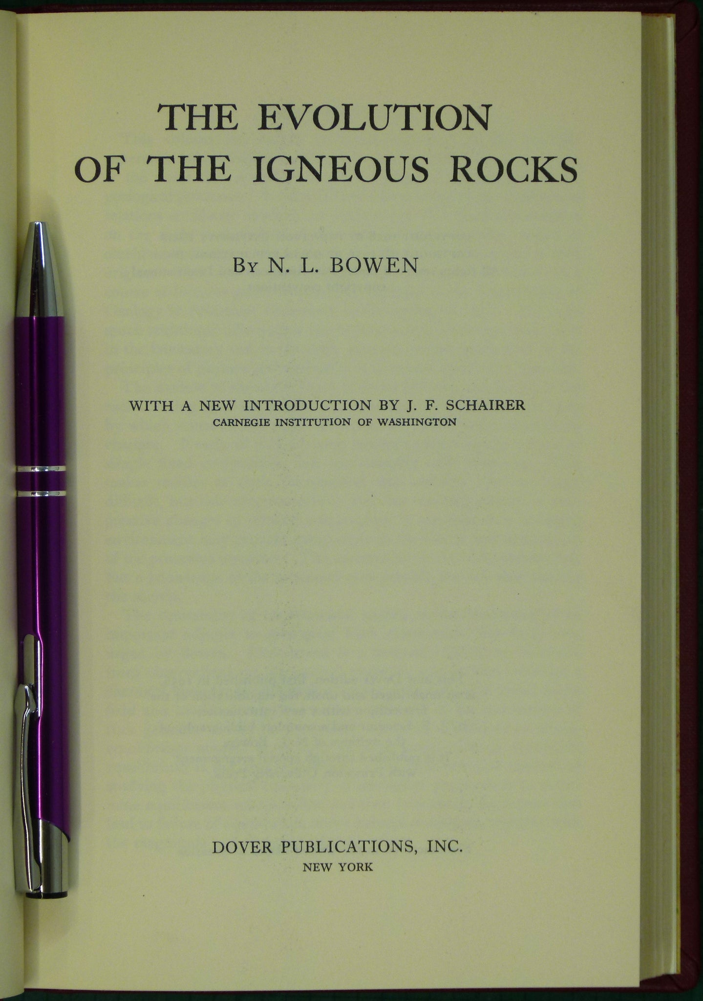 Bowen, N.L (1956). The Evolution of the Igneous Rocks. New York: Dover, facsimile of 1st edition 1928. xii + 334pp. Modern rebound hardback,