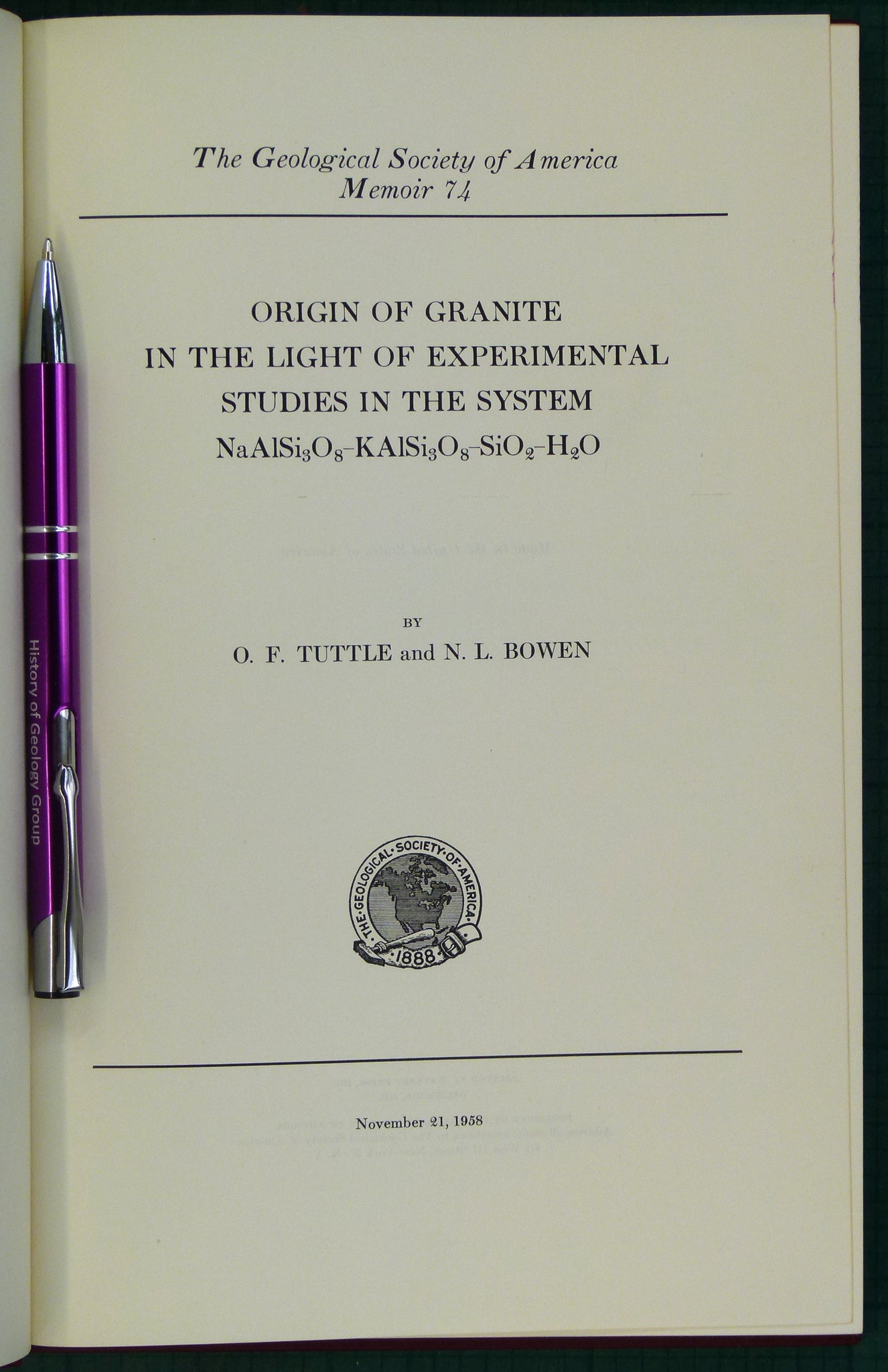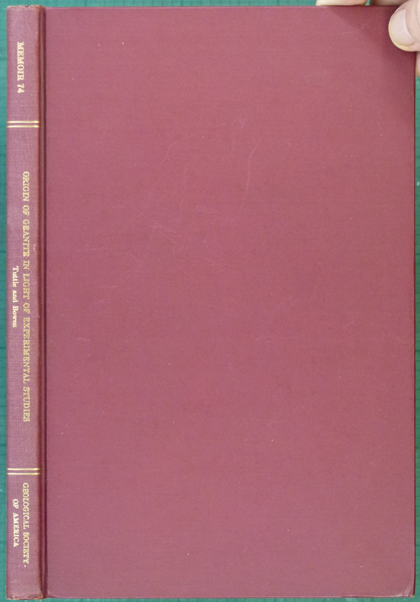 Tuttle, O.F. and Bowen, N.L.. (1958). Origin of Granite in the Light of Experimental Studies in the System NaAlSiO3-KAlSi3O3-SiO2-H2O. Geological Society of America Memoir 74, New York: GSA, 1st edition, xi + 153pp. Hardback, maroon cloth-covered boards, with gilt lettering to spine. Negligible shelf wear, Owner signature on front free end-paper. Text clean and unmarked. In very good to fine condition.