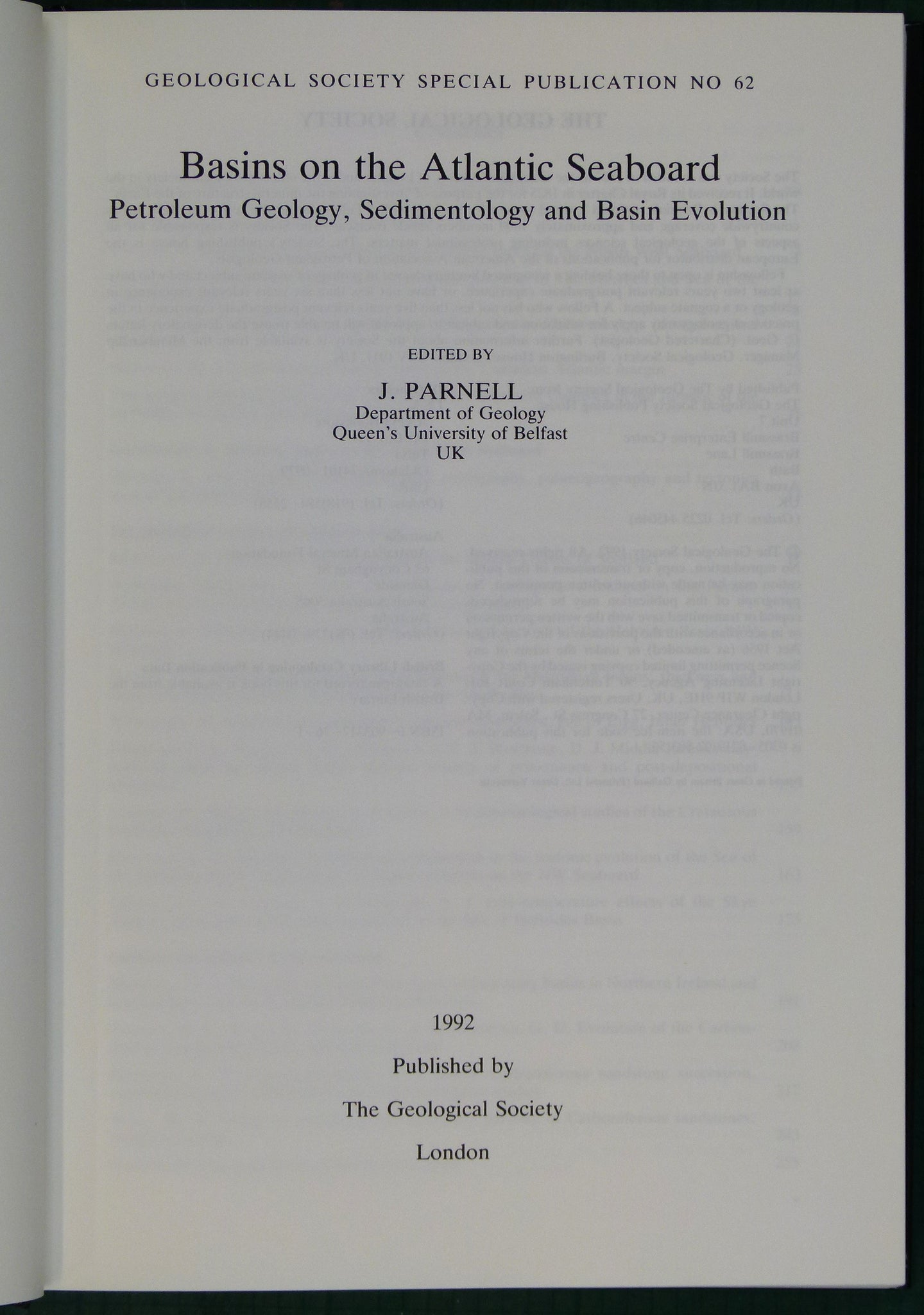 Parnell, J. (ed) (1992). Basins, on the Atlantic Seaboard: Petroleum Geology, Sedimentology and Basin Evolution, Geological Society Special Publication No.62. London: GSL, 1st edition. 470pp. Hardback, illustrated, gloss paper-covered boards, unworn. Text, clean, unmarked. In fine, as new condition.