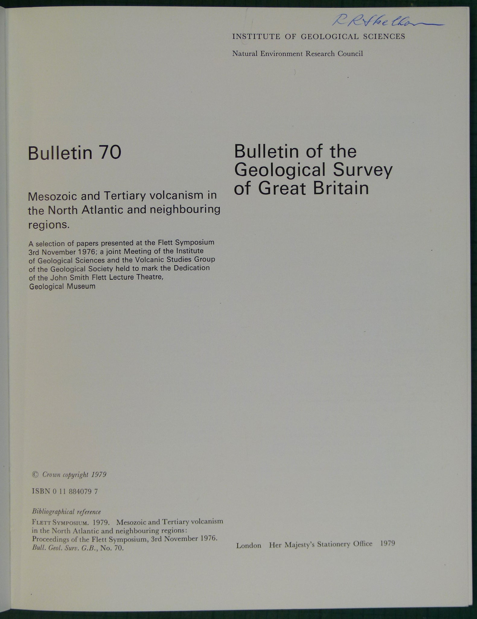 Anon. (1979). Mesozoic and Tertiary Volcanism in the North Atlantic and Neighbouring regions: Procedings of the Flett Symposium; Bull. of the Geological Survey of GB, No. 70. London: Institute of Geological Sciences [now BGS], 1st edition, 71 pp. Paperback A4 format, owner signature on title page, otherwise text is unmarked, clean and in very good condition.