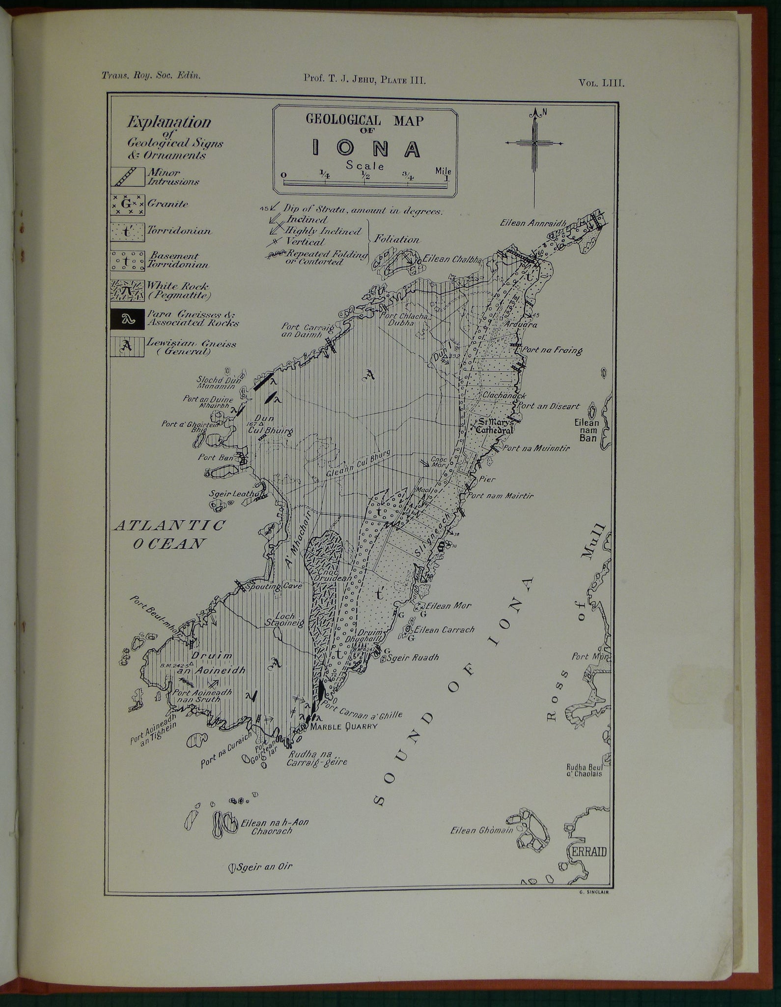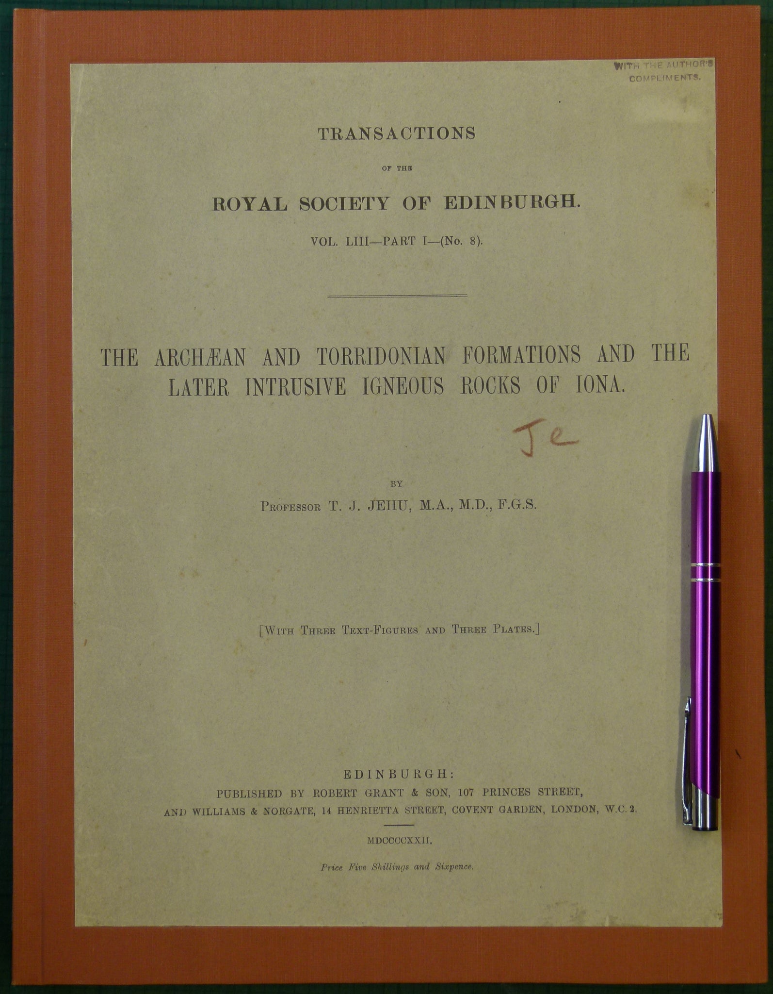 Jehu, T.J. (1922). The Archaean and Torridonian formations and the Later Intrusive Igneous Rocks of Iona. Edinburgh: Royal Society of Edinburgh. Off print from the Transactions of the RSE.v.53, pt.1, pp.165-187 + 2photo plates and 1 map plate, ‘Geological Map of Iona, 1:31,680, Hardback, with orange cloth-covered boards, 32 x 25, with offprint cover pasted down on front and manuscript title to spine. Unworn cover, paste down original cover is slightly soiled and has library stamps. Text age-toned with minor flattened creases, but clean and unmarked. In good to very good condition.