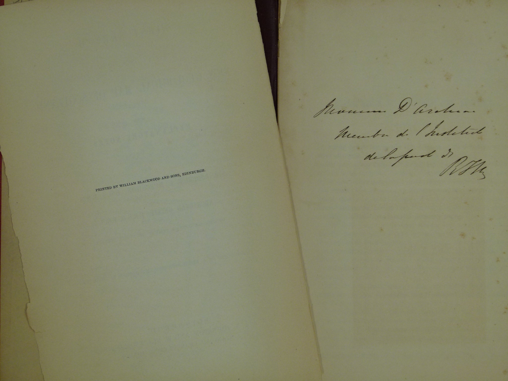 Murchison, Roderick I. and Geikie, Archibald (1861). First Sketch of a New Geological Map of Scotland. Edinburgh: W.& A.K.Johnston. 1st edition. Scale 1: 1,584,000 (1 inch = 25 miles) colour printed lithograph 43.5 x 37cm, folding to 21.5 x 13cm within red embossed cloth-covered boards with gilt lettering on front. Colours bright, paper clean, but split on all folds and requires reassembly by mounting on linen or by taping. The cover boards are worn, were parted and long ago repaired from the inside with brown cloth tape. Two library labels, including Bibliotheque de Jules Marcou, pasted inside front cover. 22 page First Sketch of a New Geological Map of Scotland with Explanatory Notes pages are loose but complete with manuscript dedication initialled by RIM to a ‘----- D’Archon, Membre d l’Institute de la ------.’ (blanks were not legible). Map panels and text of Notes are in good condition to repair.