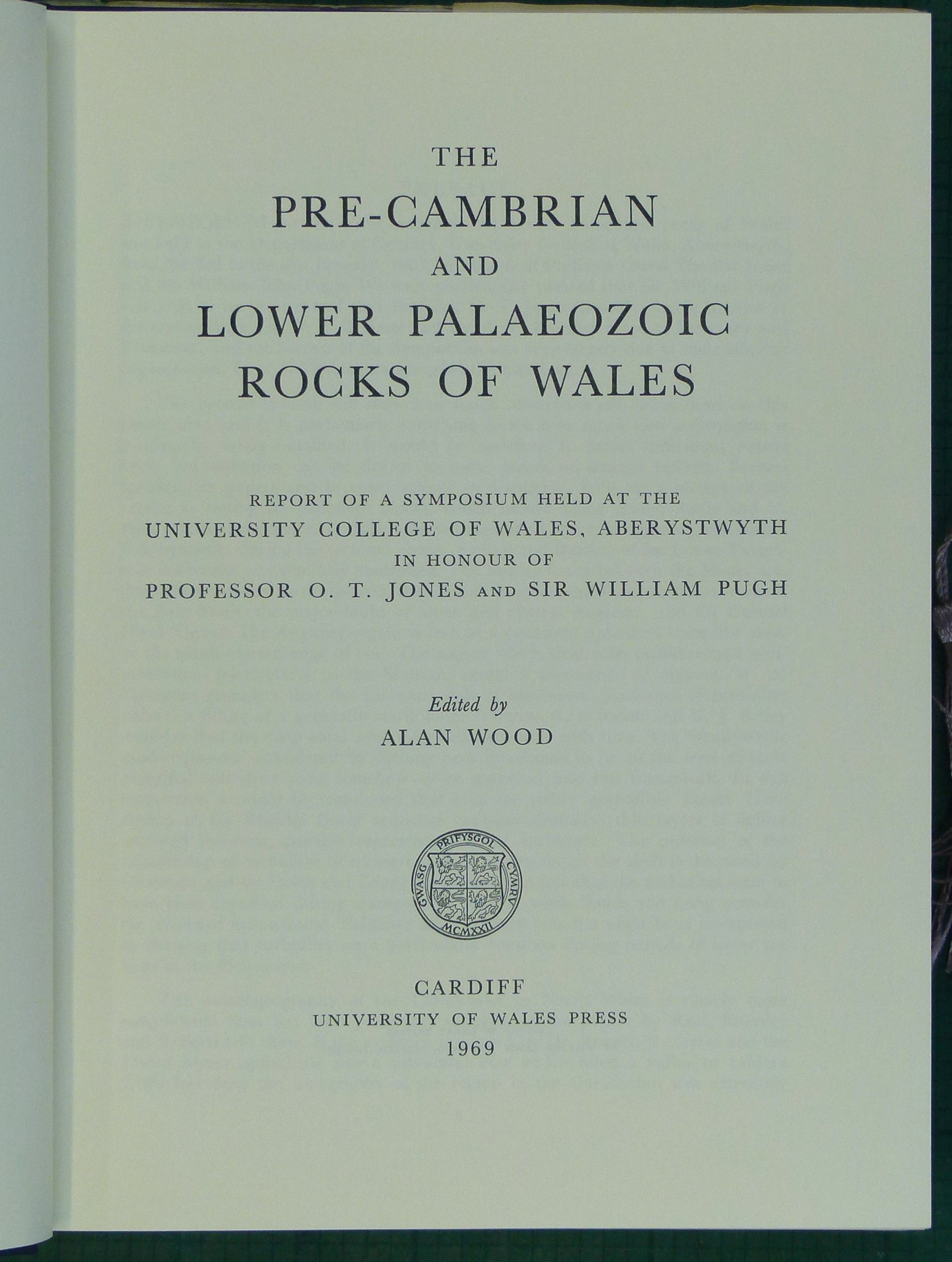 Wood, Alan. (ed) (1989). The Pre-Cambrian and Lower Palaeozoic Rocks of Wales. Cardiff: University of Wales Press, 1st edition.  x + 451pp. Hardback, Blue cloth-covered boards with gilt lettering to spine, negligible shelf wear. Dust jacket with worn with spine faded. Apart from owner signature the text is, clean, unmarked and in very good condition.