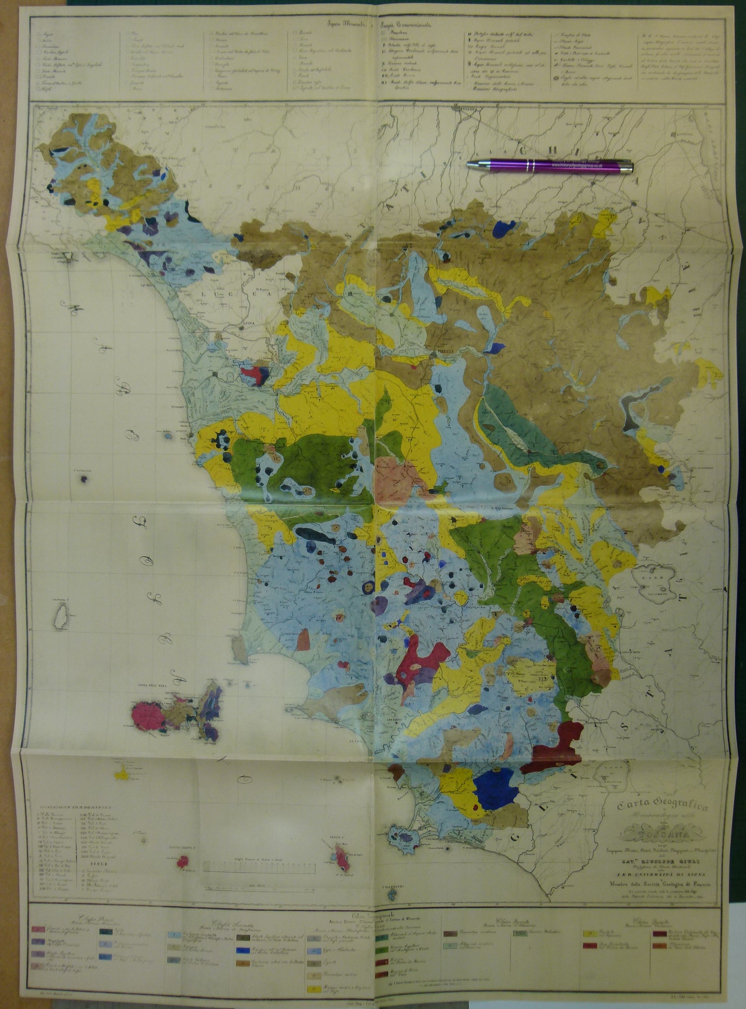 Corsi, Pietro, et al (ed). (2004). ‘The Italian Geological Survey, 1861-1970; a Preliminary History’, pp 8-22 within HistMap / Historical Geothematic Cartography. Rome: SystemCart S.R.L. 40pp. Paperback. A4 format with 7 reproduced colour printed historic geological maps all within matching folder Bi-lingual Italian/English. Six maps reduced to A4 of Compagna Romana, Penninischen Alpen, Savoy, Liguria, Roma, Stretto di Messina and Sicily, and one facsimile geological map of Tuscany. 84 x 59.5cm. good to very good condition.