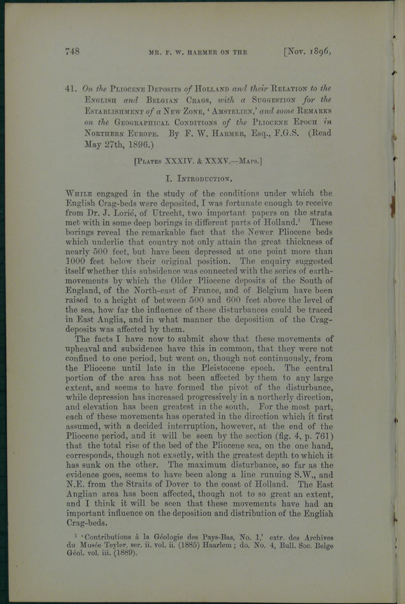 Harmer, F.W. (1896). ‘On the Pliocene deposits of Holland and their Relation to the English and Belgian Crags [and] . . . Pliocene Epoch in Northern Europe’ extract from the QJGS. Geological Society of London.