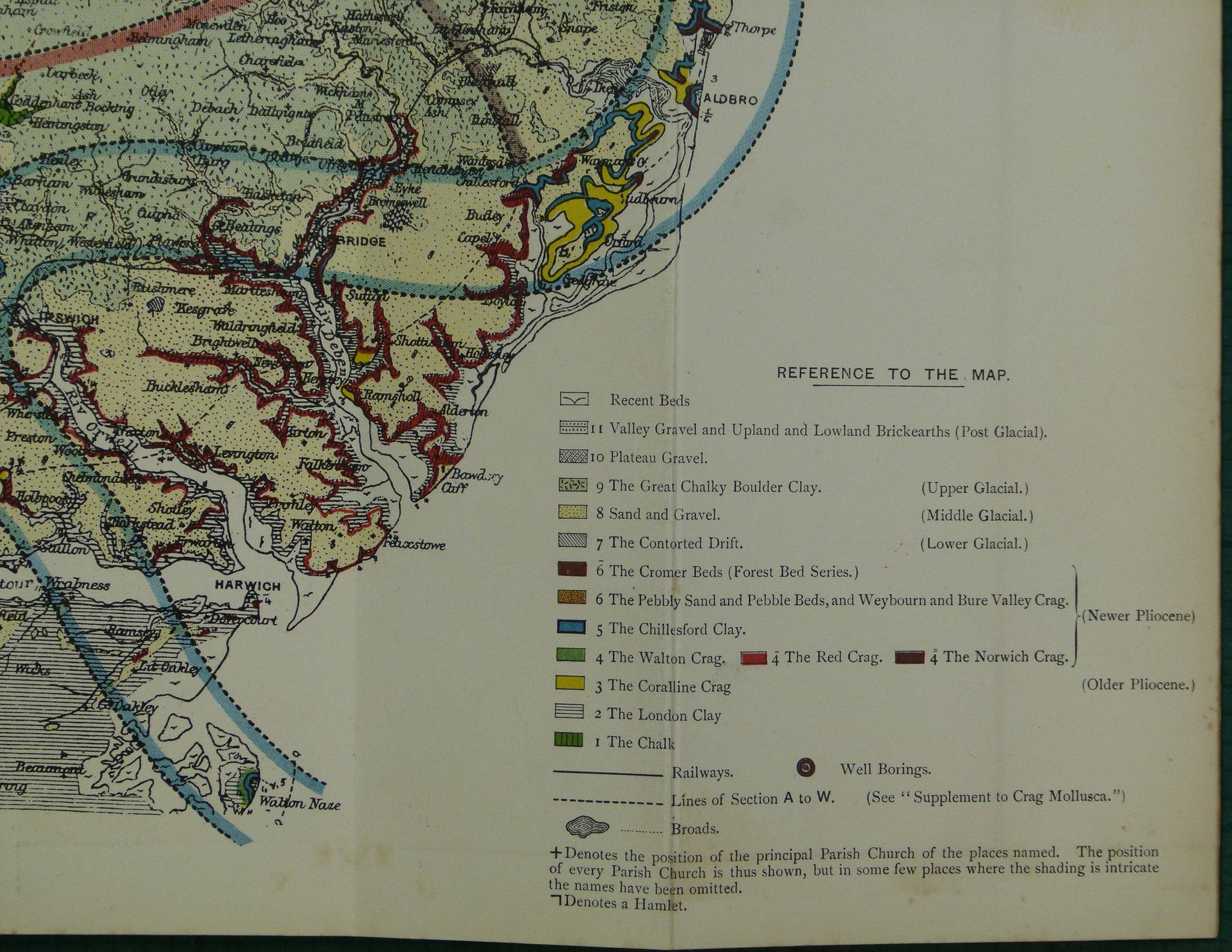 Harmer, F.W. (1896). ‘On the Pliocene deposits of Holland and their Relation to the English and Belgian Crags, with a Suggestion for the Establishment of a New Zone, ‘Amstelien’ and some Remarks on the Geographical Conditions of the Pliocene Epoch in Northern Europe’ extract from the Quarterly Journal of the Geological Society of London, v.52. pp.748-782. With two foldout colour printed maps: ‘Map to Illustrate the possible Distribution of Land and Water in the Anglo-Dutch area, during the various stages of the Pliocene’ c.1:260,000, 25.5 x 19.5cm, and ‘The Crag District, Showing all the upper Tertiary formations and, hypothetically, of the various stages of the Newer Pliocene period in East Anglia’ 1:253,440, 52 x 24.5cm. Maps and text clean, unmarked, age-toned. In good to very good condition.