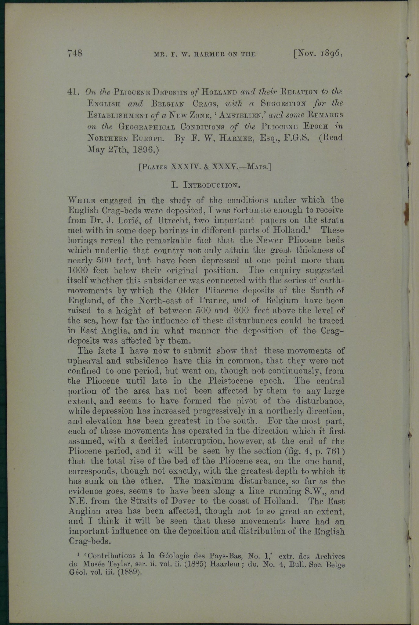 Harmer, F.W. (1896). ‘On the Pliocene deposits of Holland and their Relation to the English and Belgian Crags [and] . . . Pliocene Epoch in Northern Europe’ extract from the QJGS