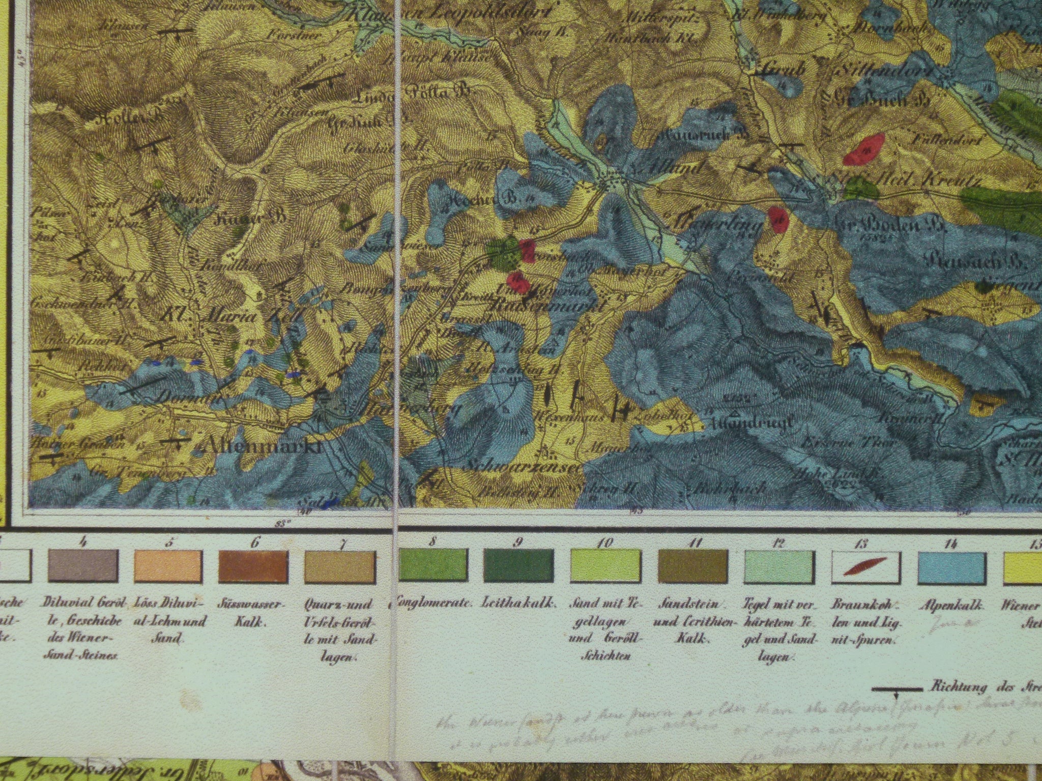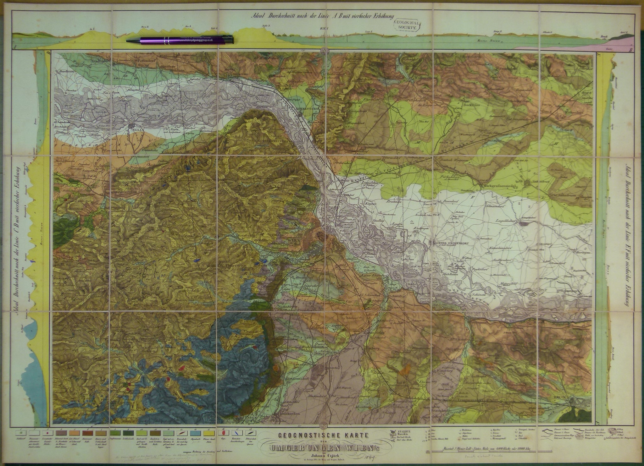 Czizek Johann Bapt. (1847). Geognostiche Karte Ungebunen Wien’s [Vienna, Austria]. Reproduction. 1 inch to a mile approx.., 59 x 81cm. same size as original map. The original map was a hand-coloured engraving, dissected and mounted on linen to fold. In the repro, the cuts and linen show, as do pencil annotations of its owner, G.B.Greenough, and a library stamp. Faithful copy on heavy paper.