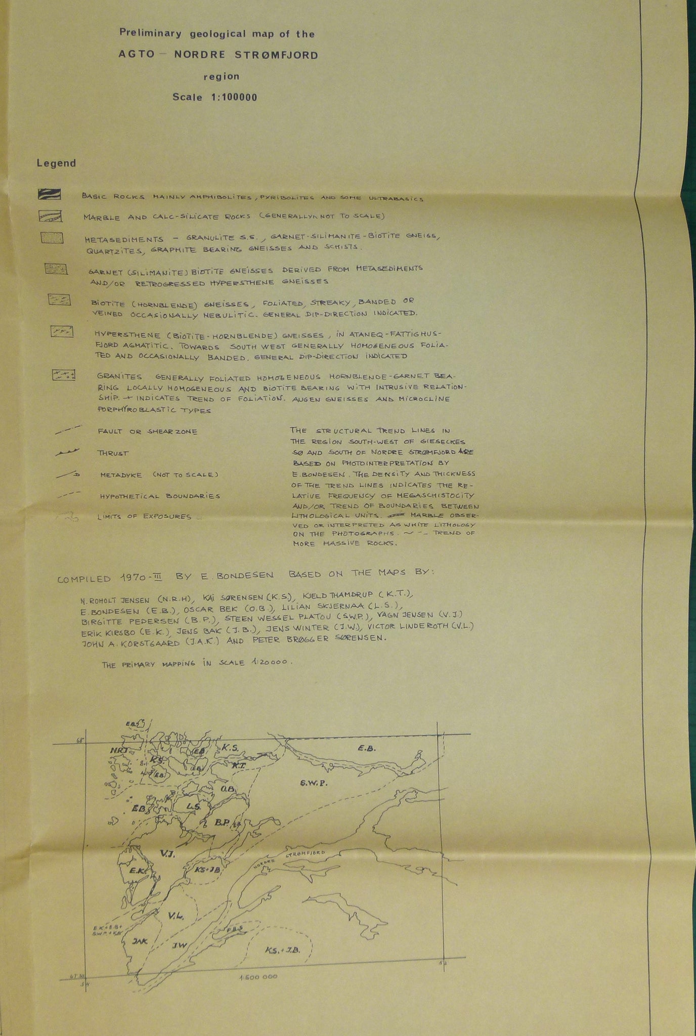 Greenland. Preliminary Geological Map of the Agto-Nordre Stromfjord Region (1970). Geological Survey of Greenland. Folded b/w map, 1:200,000, 61 x 66cm folding to 23 x 16cm. Clean, negligible wear. In good to very good condition.