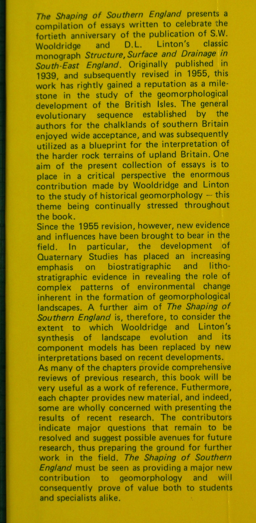 Jones, D.K.C. (ed) (1980). The Shaping of Southern England, Inst. of British Geographers Special Publ’n, No.11. London: Academic Press, 1st edition. 247pp. Hardback with green-cloth-covered embosed boards with gilt lettering to spine. slight shelf wear, binding sound. Dustjacket as new.  Apart from owner signature the text is clean and unmarked and in very good to fine condition.
