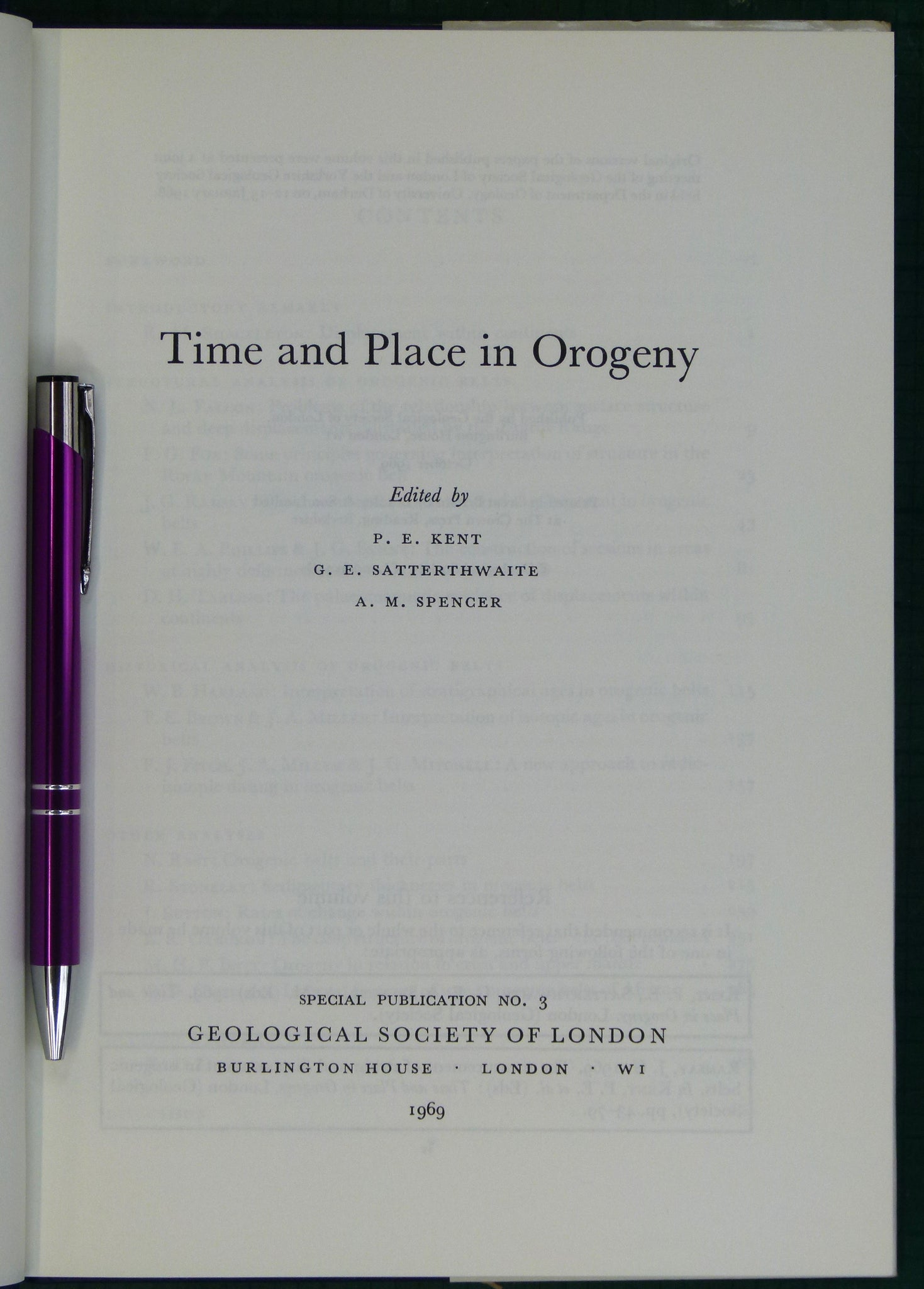 Kent, P.E. et al (eds) (1969). Time and Place in Orogeny: London Geological Society Special Publication no.3. London: Geological Society, 1st