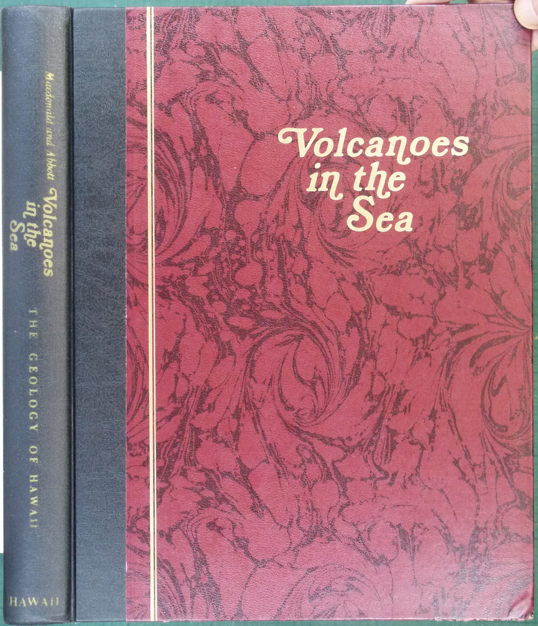MacDonald, G.A. and Abbott, A.T, (1971). Volcanoes in the Sea: the Geology of Hawaii. Honolulu: University of Hawaii Press, 2nd printing of 1st edition (1970), iv + 441 pp, Hardback, marbled brown faux leather-covered board with black cloth half-binding and gilt lettering to spine and cover. Negligible shelf wear. Dustjacket slightly worn. Text clean, unmarked. Owner signature on front free end-paper. In very good to fine condition.