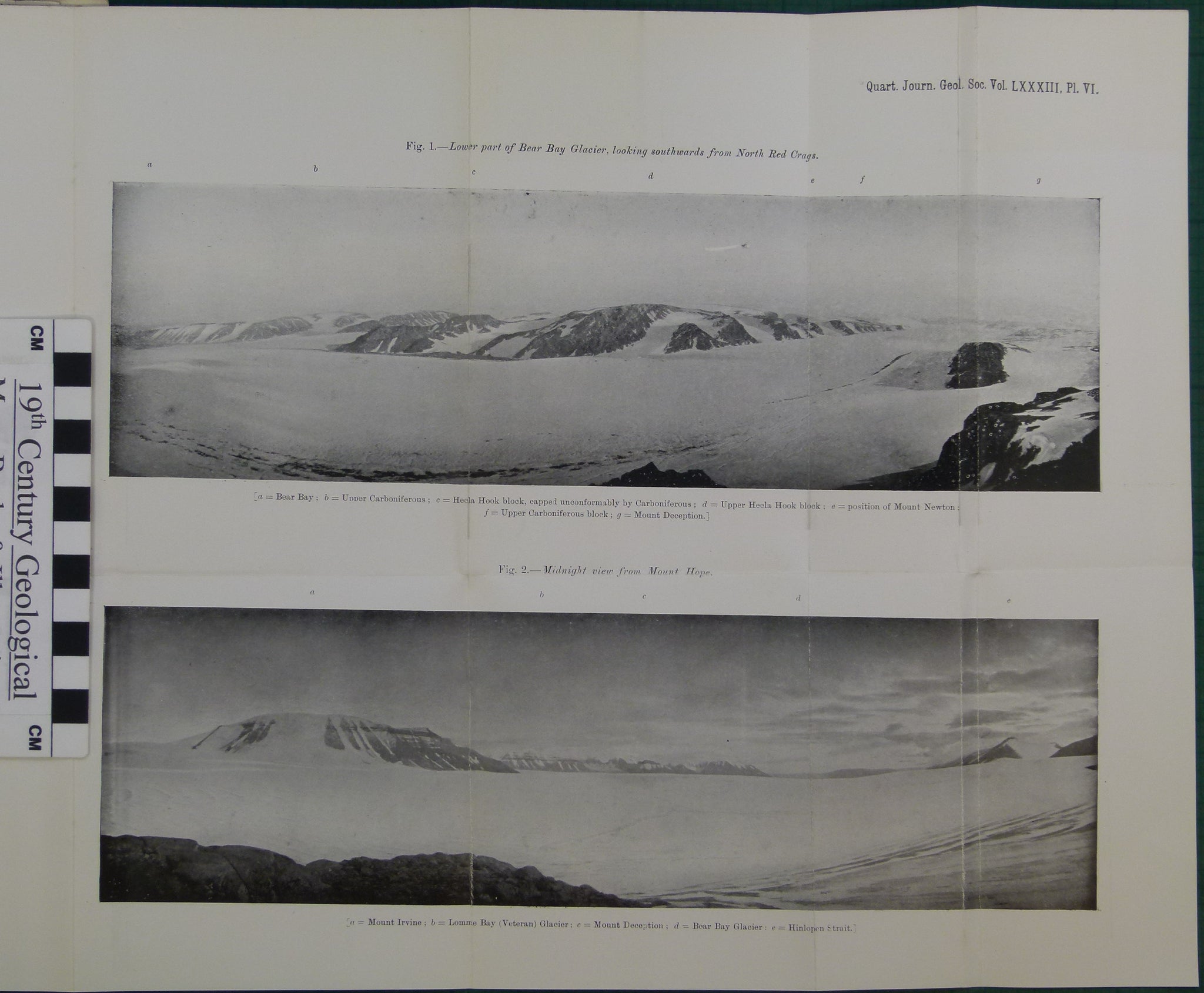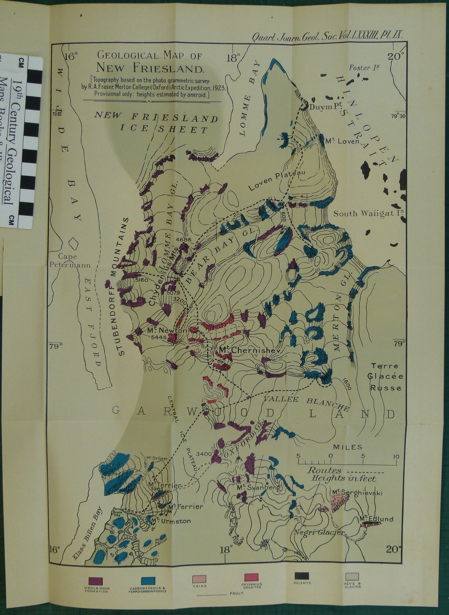 Odell, N.D. (1925). ‘Preliminary Notes on the Geology of the Eastern Parts of Central Spitzbergen: with special reference to the Problem of the Hecla Hook formation’ elsewhere’ extract from the Quarterly Journal of the Geological Society of London, v.83, pp.147-162. With colour printed foldout ‘Geological Map of New Friesland’ 1:316,800 scale, 46 x 33.5cm, and three foldout photographic plates of panoramic views of glaciers and outcrops. Map, photo plates and text clean, unmarked, age-toned. In good to very good condition.