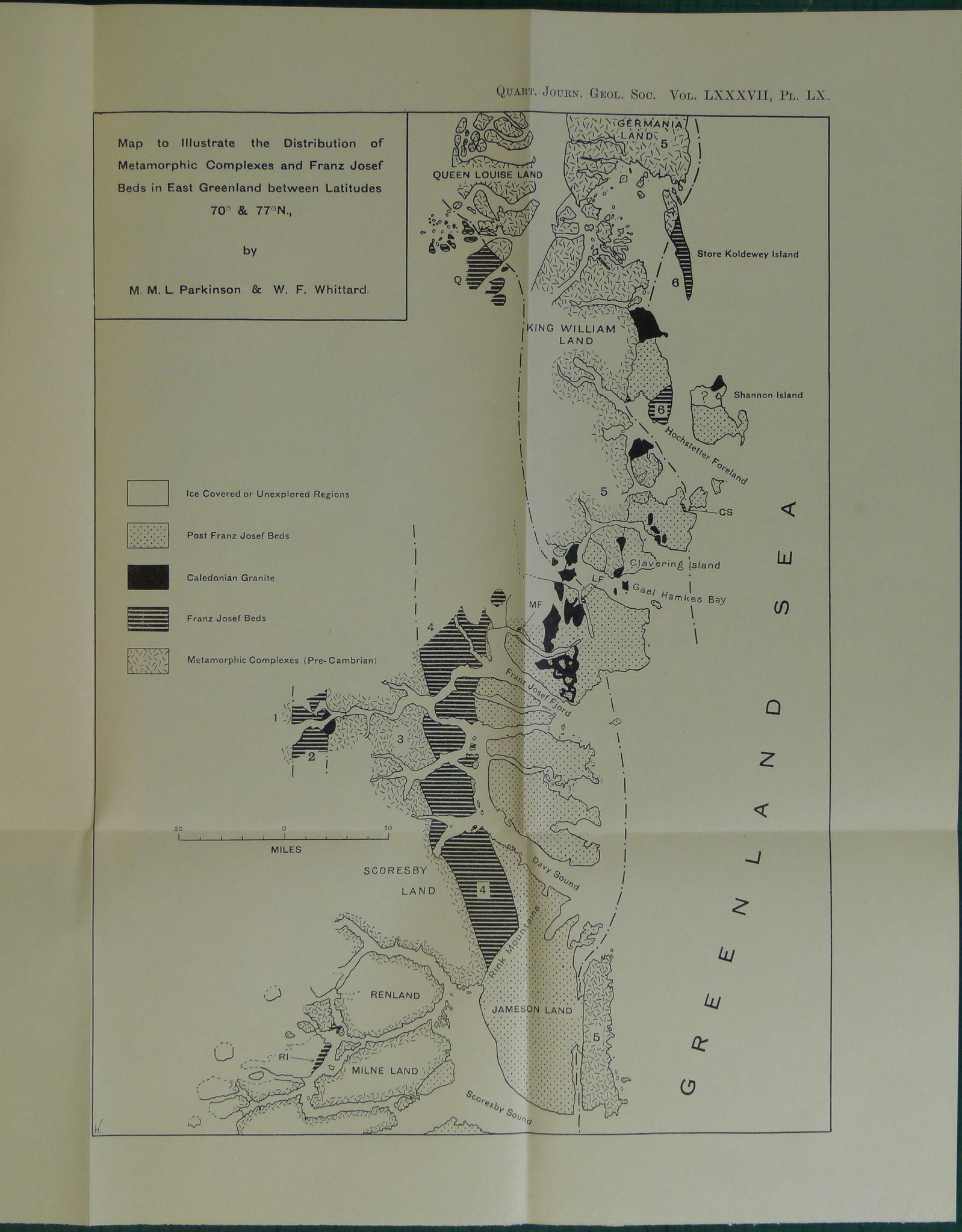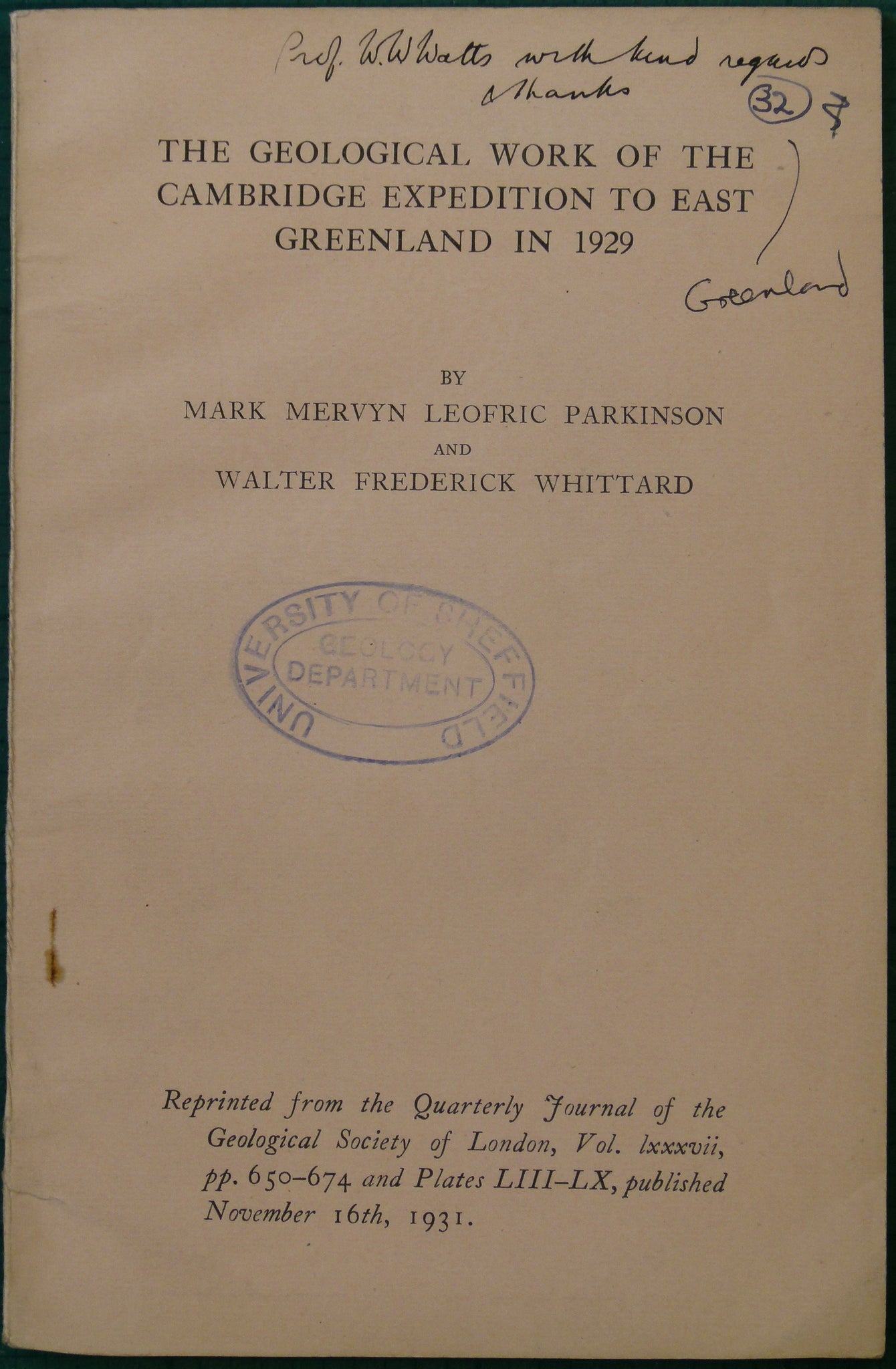 Parkinson, M.M.L. and Whittard, W.F. (1931). ‘The Geological Work of the Cambridge Expedition to East Greenland in 1929’ reprint from the QJGS