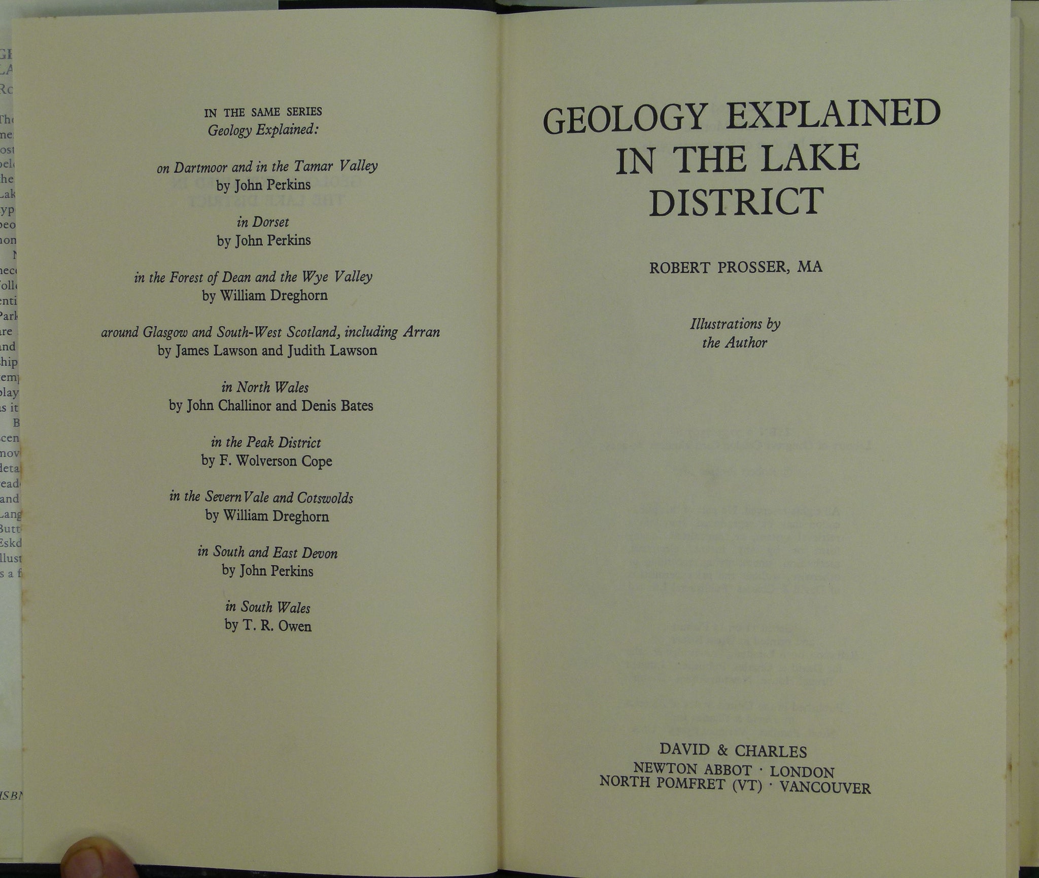Prosser, Robert (1977). Geology Explained in the Lake District. Newton Abbot: David and Charles. First edition. 189pp. HB.