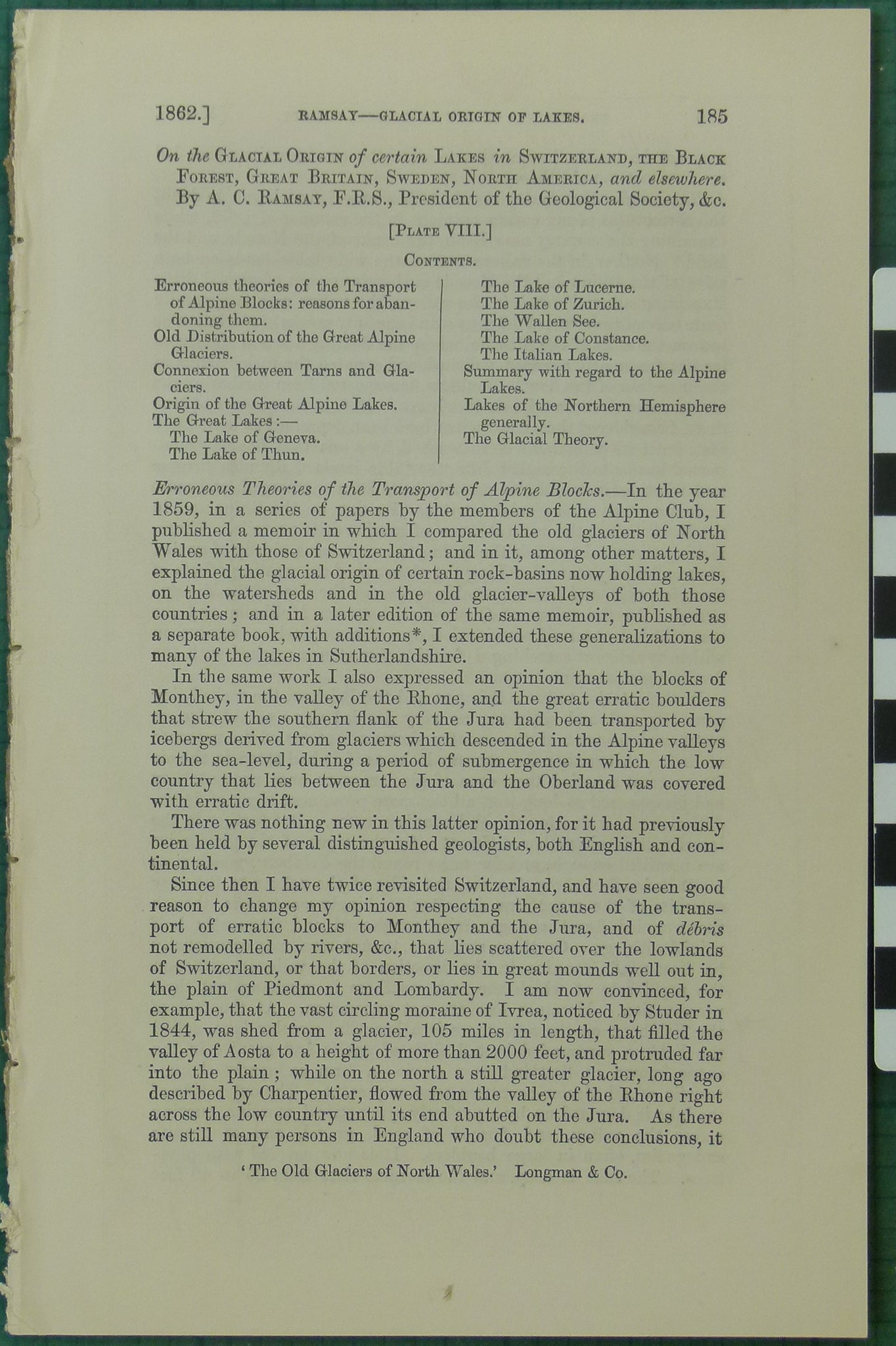 Ramsay, A.C. (1862). ‘On the Glacial Origin of certain Lakes in Switzerland, the Black Forest, Great Britain, Sweden, North America, and elsewhere’ extract from the QJGS