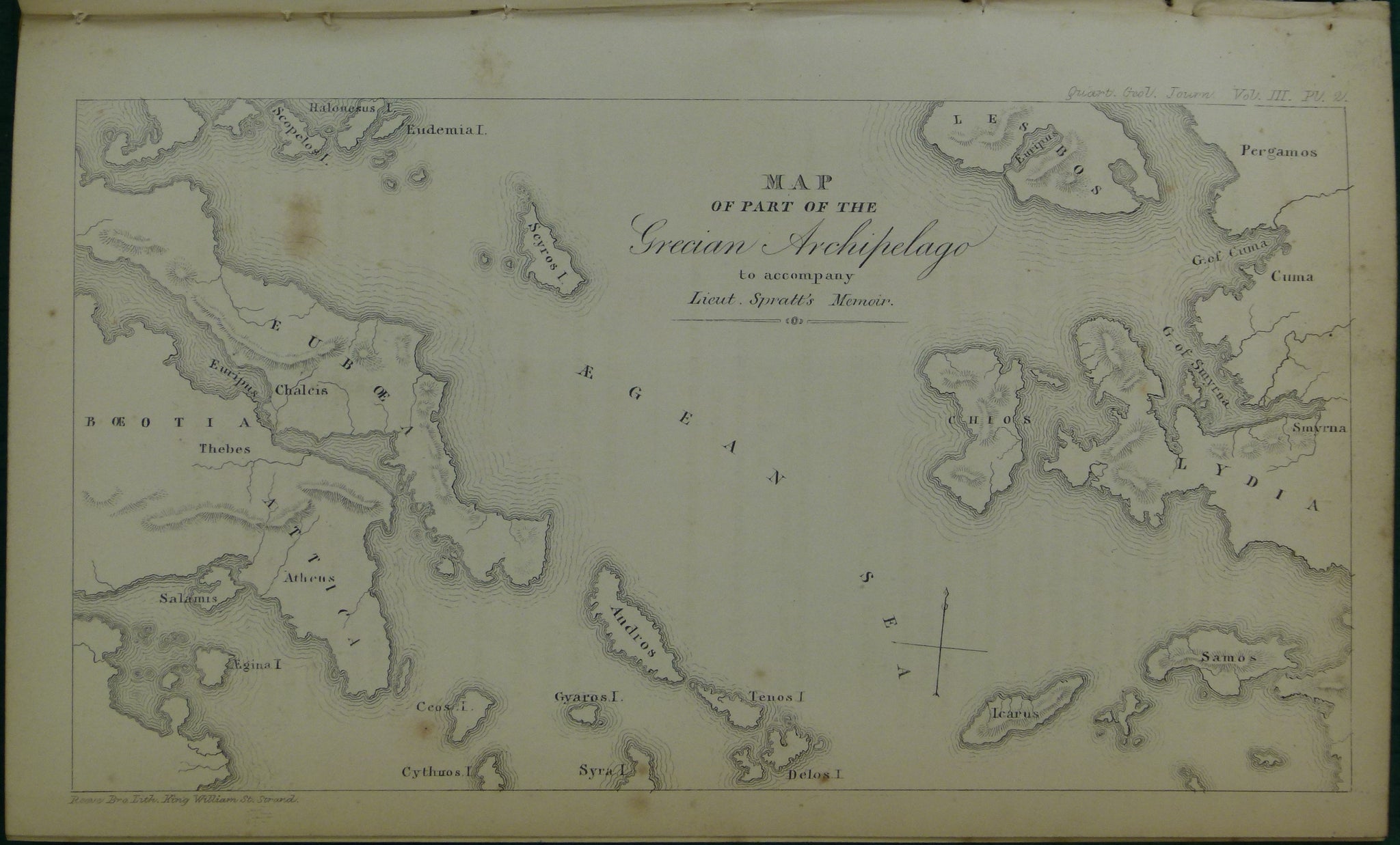 Spratt, Lieut. RN ( 1847). ‘On the Geology of a part of Euboea and Boeotia’ extract from the Quarterly Journal of the Geological Society of London, v.3, pp. 67-74. With three maps foldout hand-coloured ‘Geological Map of Part of the Island of Euboea’ 1:380,160, 21.5 x 27cm., hand-coloured ‘Geological Map of Part of the Island of Sanos’ approx. same scale, and b/w regional small scale ‘Map of part of the Grecian Archipelago. Maps and text clean, unmarked, age-toned. In good to very good condition.