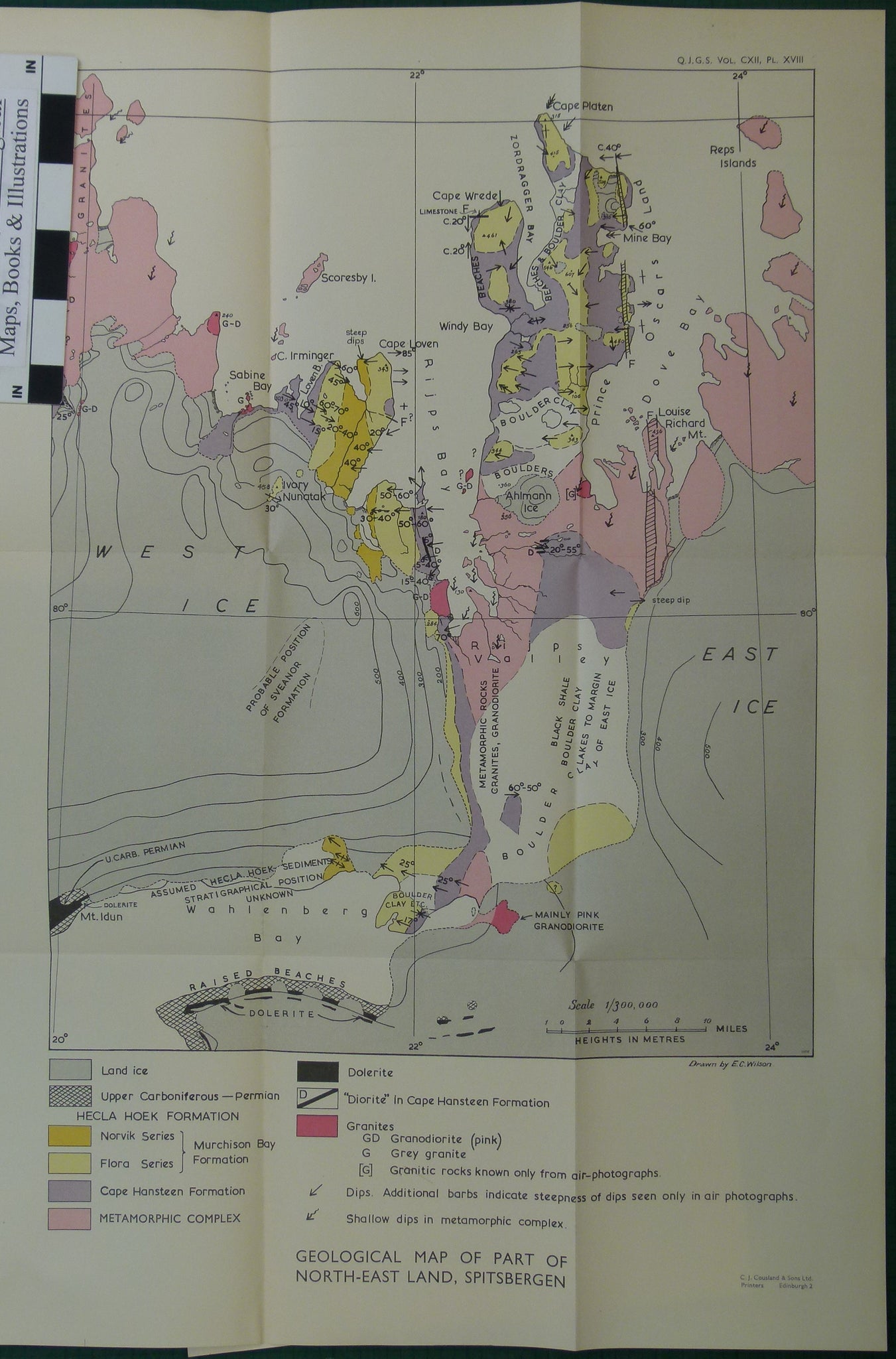 Stanford, K.S. (1955). ‘The Stratigraphy and Structure of the Hecla Hoek Formation and its Relationship to a subjacent Metamorphic Complex in North-East Land (Spitzbergen)’ extract from the Quarterly Journal of the Geological Society of London, v.112, pp. 339-362. With colour printed foldout ‘Geological Map of Part of North-East Land, (Spitzbergen’ 1:633,600 scale. 49.5 x 33.5cm, and two oblique aerial photographic plates. Map, photo plates and text clean, unmarked, age-toned. In good to very good condition.