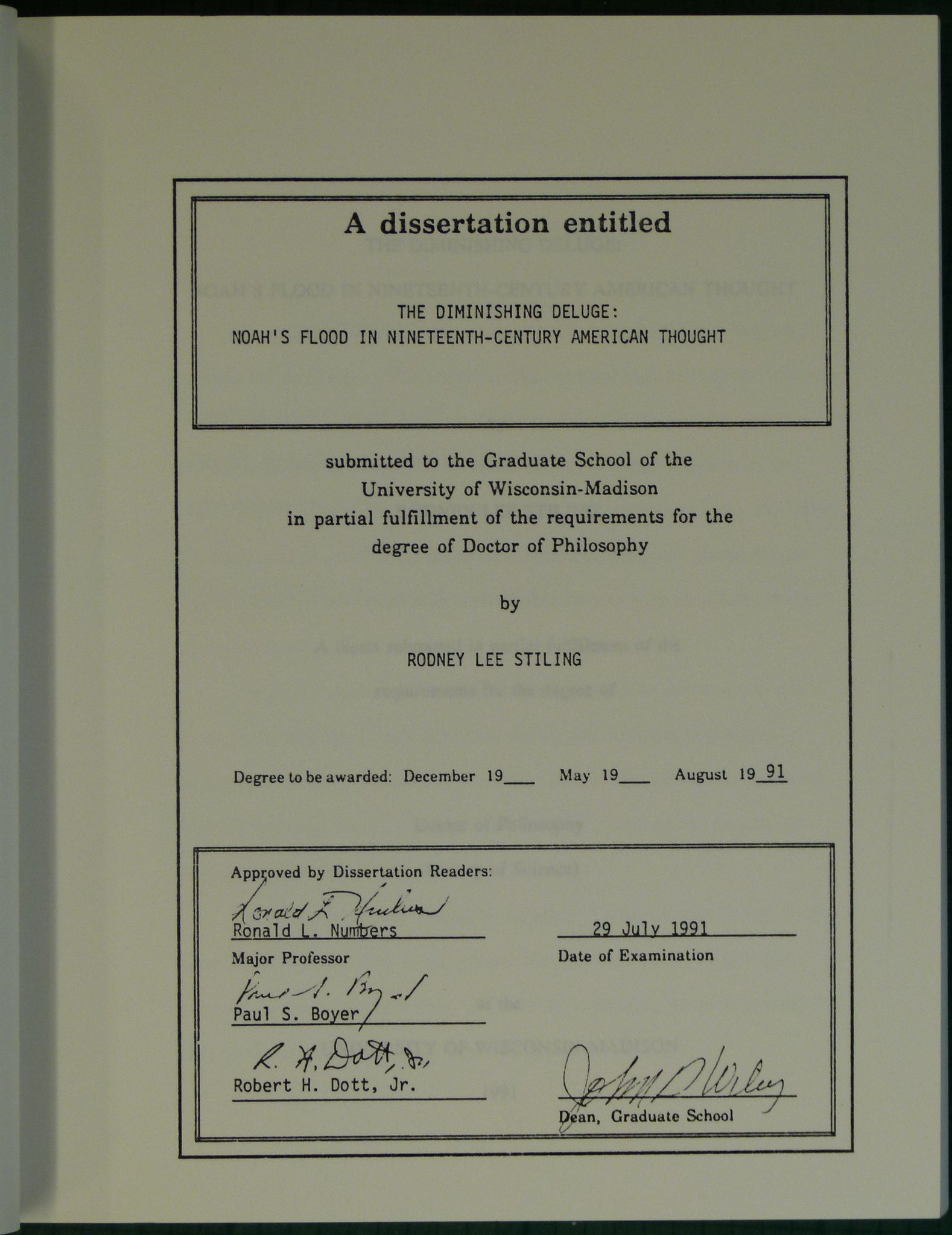 Stilling, Rodney G. (1991). The Diminishing Deluge: Noah’s Flood in Nineteenth Century American Thought. Ann Arbor: University Microfilms International