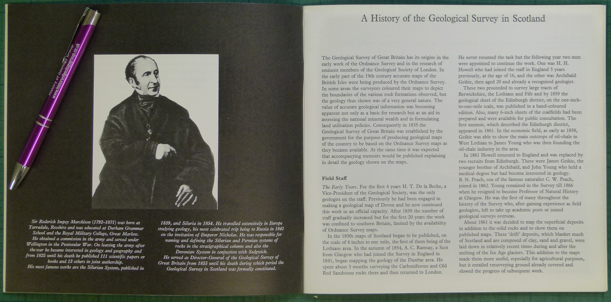 Wilson, R.B. (1977) A History of the Geological Survey of Scotland, Institute of Geological Sciences (now BGS), 24pp. PB